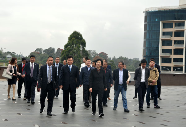 訪問團(tuán)一行首先參觀了雙河商貿(mào)中心,對雙河項(xiàng)目給予了充分肯定。座談期間,公司董事長王元旦及江西國際、江西中煤等駐肯企業(yè)代表逐一就企業(yè)在肯尼亞的發(fā)展情況進(jìn)行匯報。馮桃蓮主任充分贊揚(yáng)了江西企業(yè)在肯尼亞的各項(xiàng)優(yōu)秀業(yè)績,同時指出,在省委、省政府的正確領(lǐng)導(dǎo)下,希望各駐肯企業(yè)能夠緊密合作、抱團(tuán)發(fā)展,加強(qiáng)安全管控,提升企業(yè)抗風(fēng)險能力,樹立良好的企業(yè)形象。